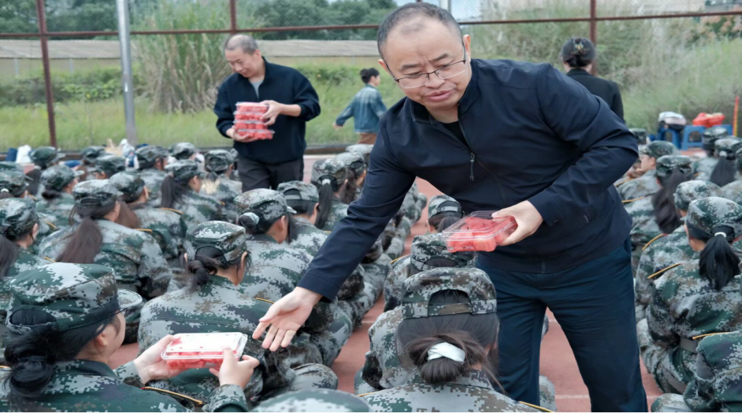 学院党委书记谭昌勇、院长杨观与教官深入交流,详细了解了新生军训的总体情况与进度,感谢教官们的辛勤付出。杨观在与同学们的交流中,强调要坚决服从军训安排和教官统一指挥,珍惜这一特殊的大学课程,发扬一不怕苦二不怕累的风格,磨炼意志,强健体魄,为未来的学习生活打下坚实的基础。同时,杨观叮嘱同学们注意劳逸结合,做好防晒与补水,确保以良好的状态圆满完成军训任务。随后,参与慰问的党政领导、老师和学生干部亲手将水果分发到每位同学手中,一句句“辛苦了”“加油”让同学们在秋日的训练场感受到了家一般的温暖。