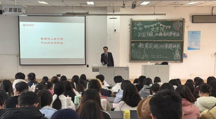 11月20日,文学院举办教育实训(二)暨基础教育名师讲堂活动(2),特邀成都市树德中学资深语文教师郑志刚为2023级学生开展题为“青春就业大讲堂:如何成为一名有光、有温度的语文老师”的专题讲座。文学院副院长沈曙东、副院长余何、实训教研室温淳秀老师、郭琼霞老师、陈彦汝老师以及258名2023级汉语言文学专业全体同学参加本次活动。